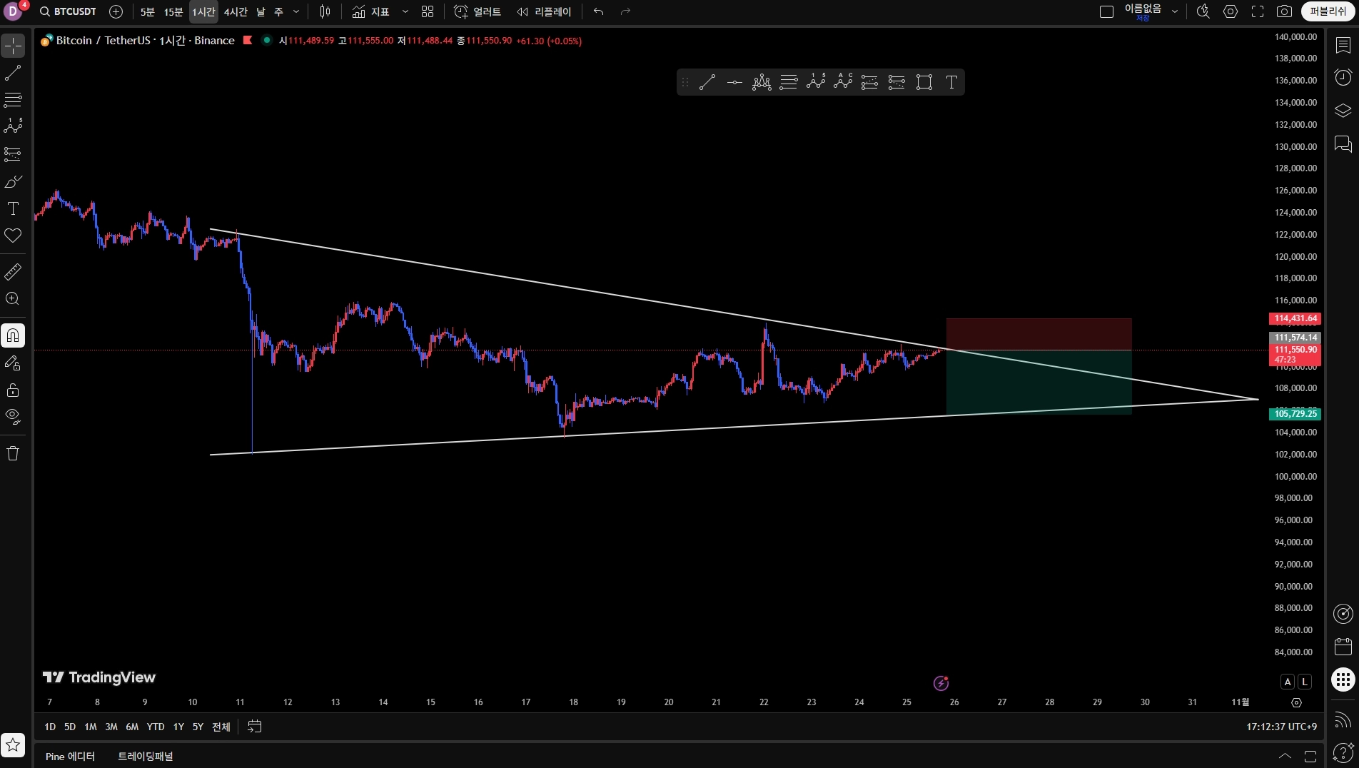 일봉구간에서 확인된 웻지패턴을 1시간봉으로 분석했더니 추세선 거의 끝자락에 닿아있어 한번 숏진입 해보려고 합니다.
