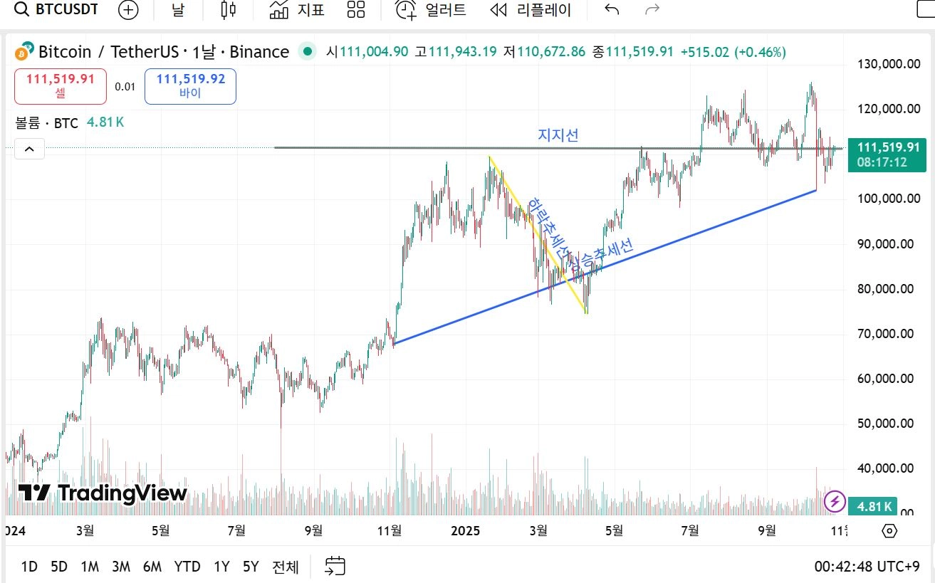 하락을 하다가 반등이 나오는 구간을 이어 추세선을 그으면 된다고 하셔서 이해한 대로 해봤습니다.