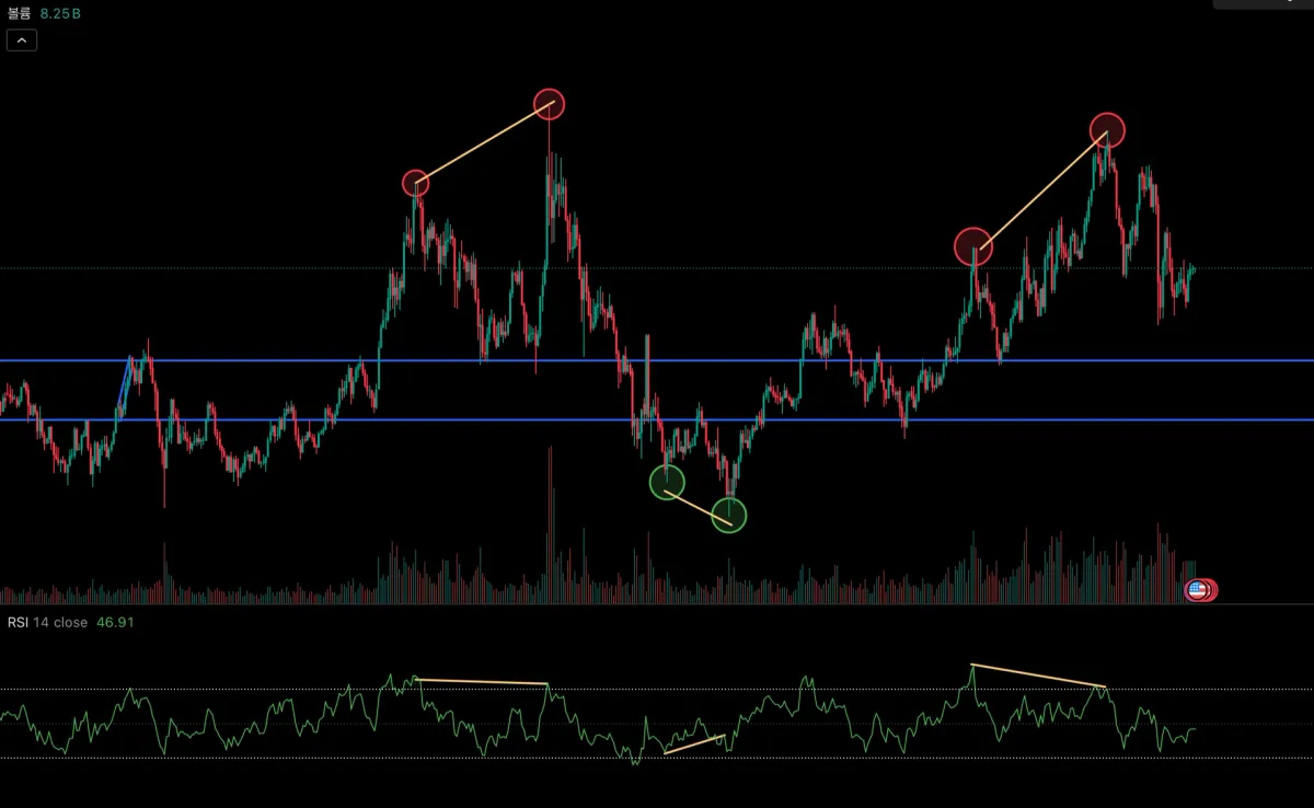 하락 다이버전스 2개, 상승 다이버전스 1개 각각 찾아보았습니다.