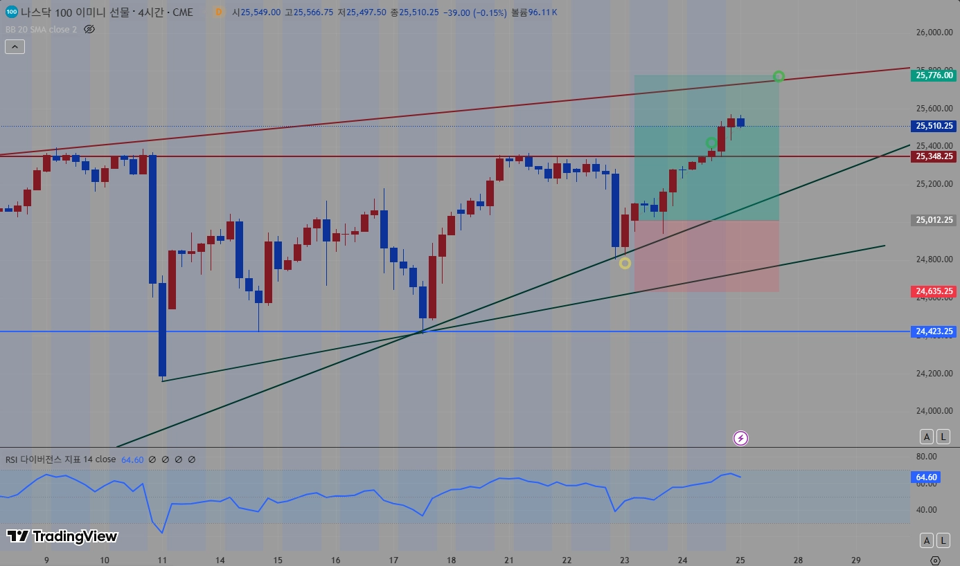 전고점 25350선에서 반청, 하고 25800 상승추세 목표로 가지고있습니다.