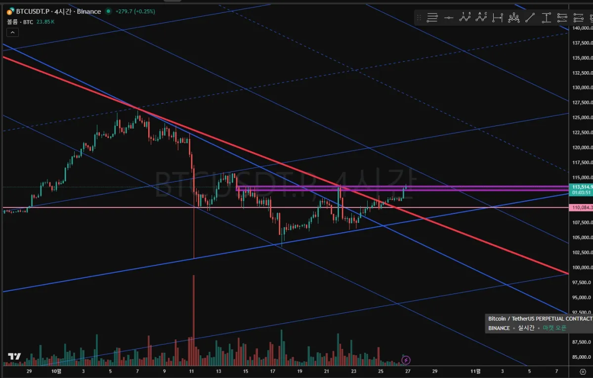 중요 추세선인 빨간선 돌파 컨펌 후 중요 매물대 구간인 보라색 구간까지 돌파하면 추가 상승 혹은 보라색구간 리테스트 예상됩니다.