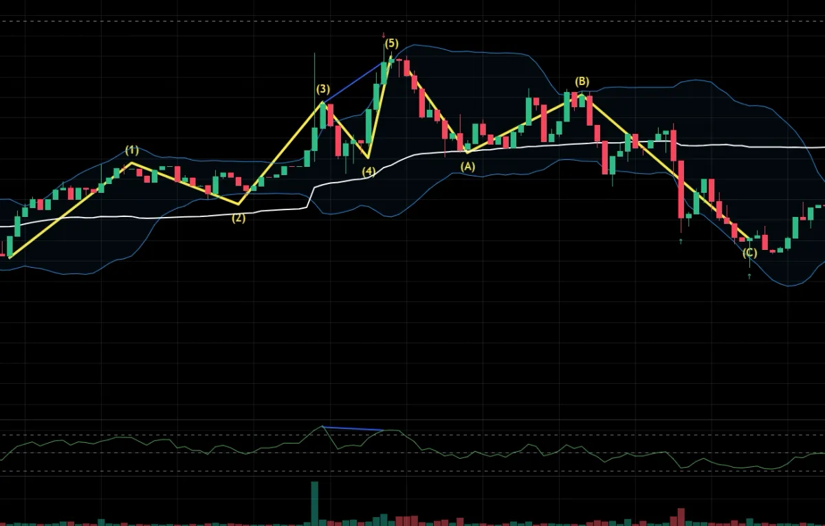 그리고 12345파동 후, 단기적인 조정이나 추세의 전환으로 인해 abc 파동과 함께 하락으로 이어지는 변화가 있을거라고 생각해서 숏 포지션으로 들어갔고 생각했고 볼린저 밴드의 아랫쪽 구간을 뚫고 내려갔을 때 한번 절반 익절했고, 조금 있다가 점점 매수세가 강해진다고 느껴져서 전량 익절했습니다.