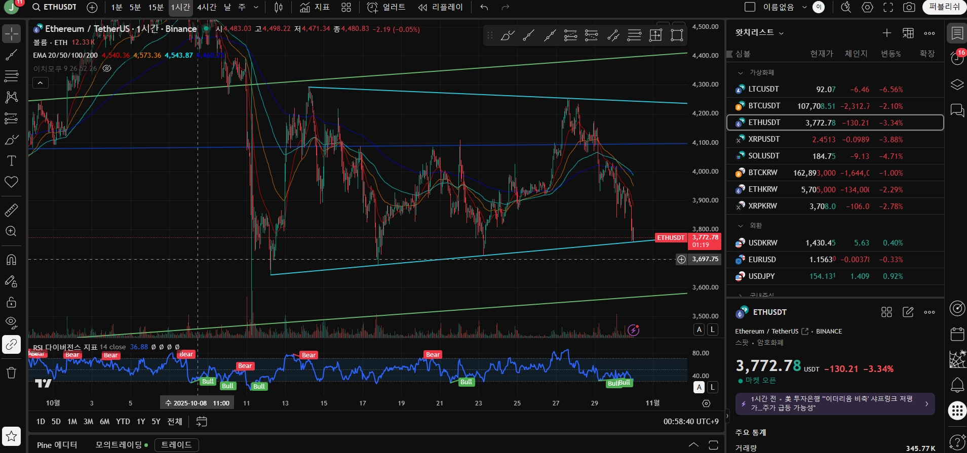 지표는 평소에 RSI, EMA 위주로 보고 가끔 높은 타임 프레임에서 일목균형표 참고해서 바닥 찾기도 합니다.
