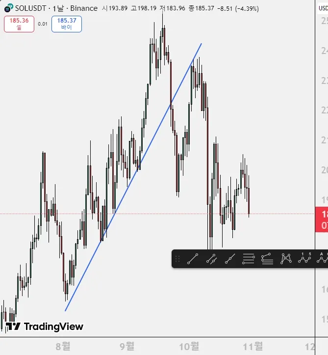 그리고 솔라나 차트에서도 지지선을 타고 상승추세로 잘 가다가 지지선을 뚫고 하락한다음 이후에 상승하려다가 이전의 지지선이 저항선이 되어 뚫지 못하고 다시 하락한것으로 보여집니다