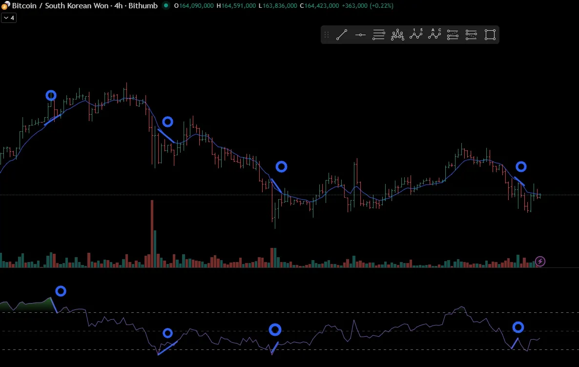 첫 번째 다이버전스에서는 RSI가 70 이상이었다가 하락세를 보이고 있으니 상승장이 약해질 것을 대비해야하고