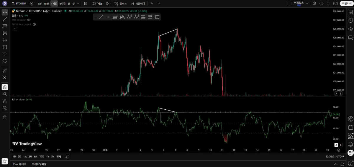 위 사진에서 가격 고점은 높아졌으나, RSI 고점이 낮아짐에 따라 하락 다이버전스를 확인할 수 있습니다.