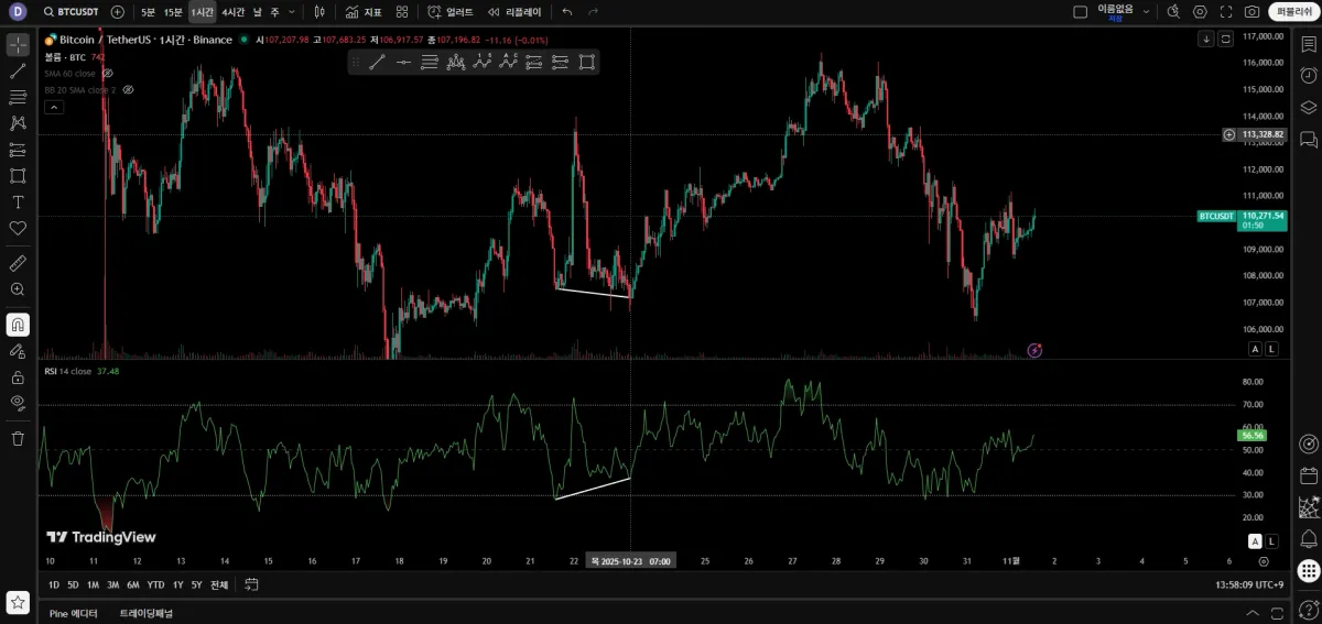 위 사진에서 가격 저점은 내려갔으나, RSI 저점이 올라감에 따라 상승 다이버전스임을 확인할 수 있습니다.