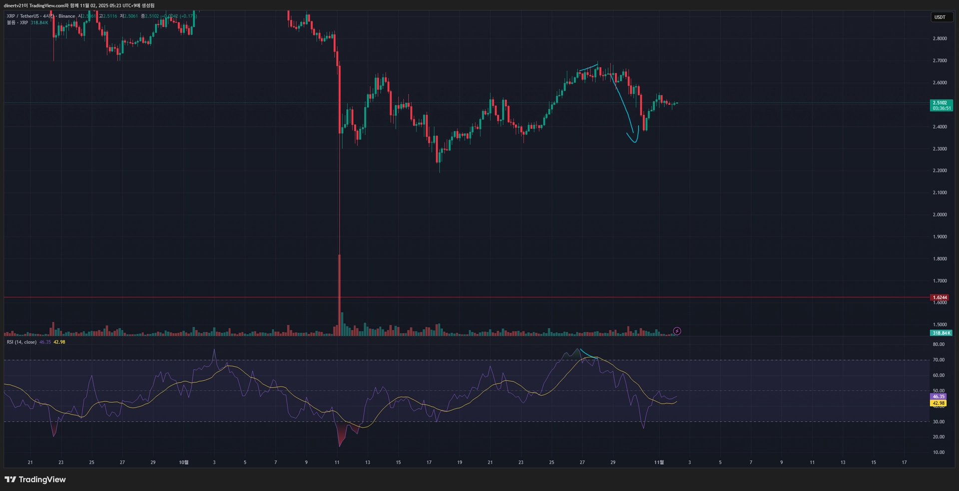 가격의 고점은 상승하였지만, RSI의 고점은 하락하는 다이버전스 이후 하락이 발생하였습니다.