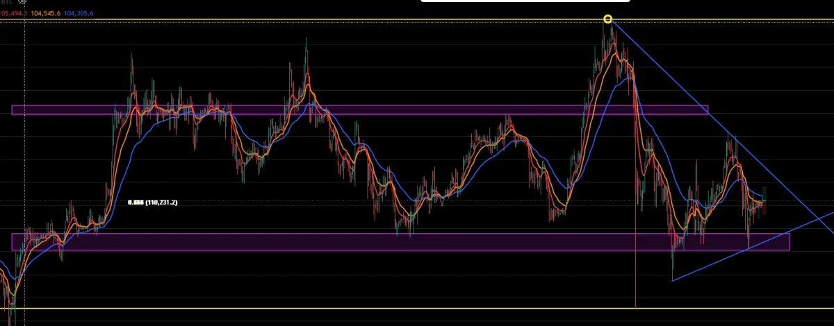 노란색 선으로 최고점 지지와 최저점 저항을 크게 표현하고, 보라색 박스로 매물대 및 실질적인 지지, 저항을 표현했습니다.
