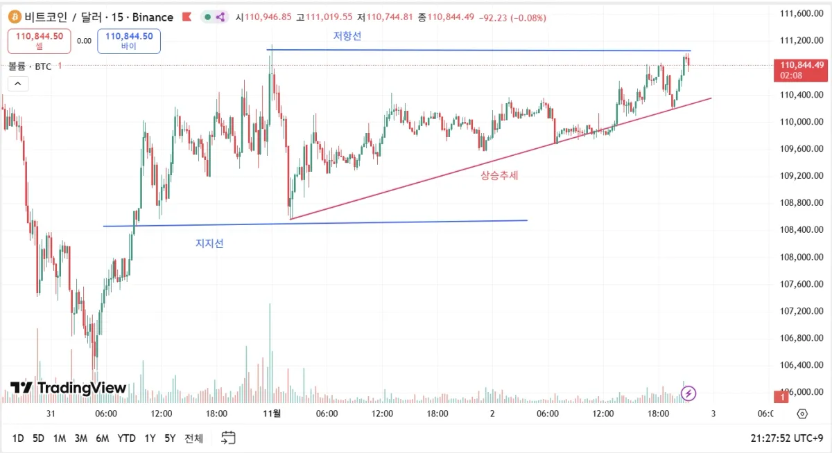 15분봉 기준으로 지지 저항 및 추세 작도 해보았습니다.