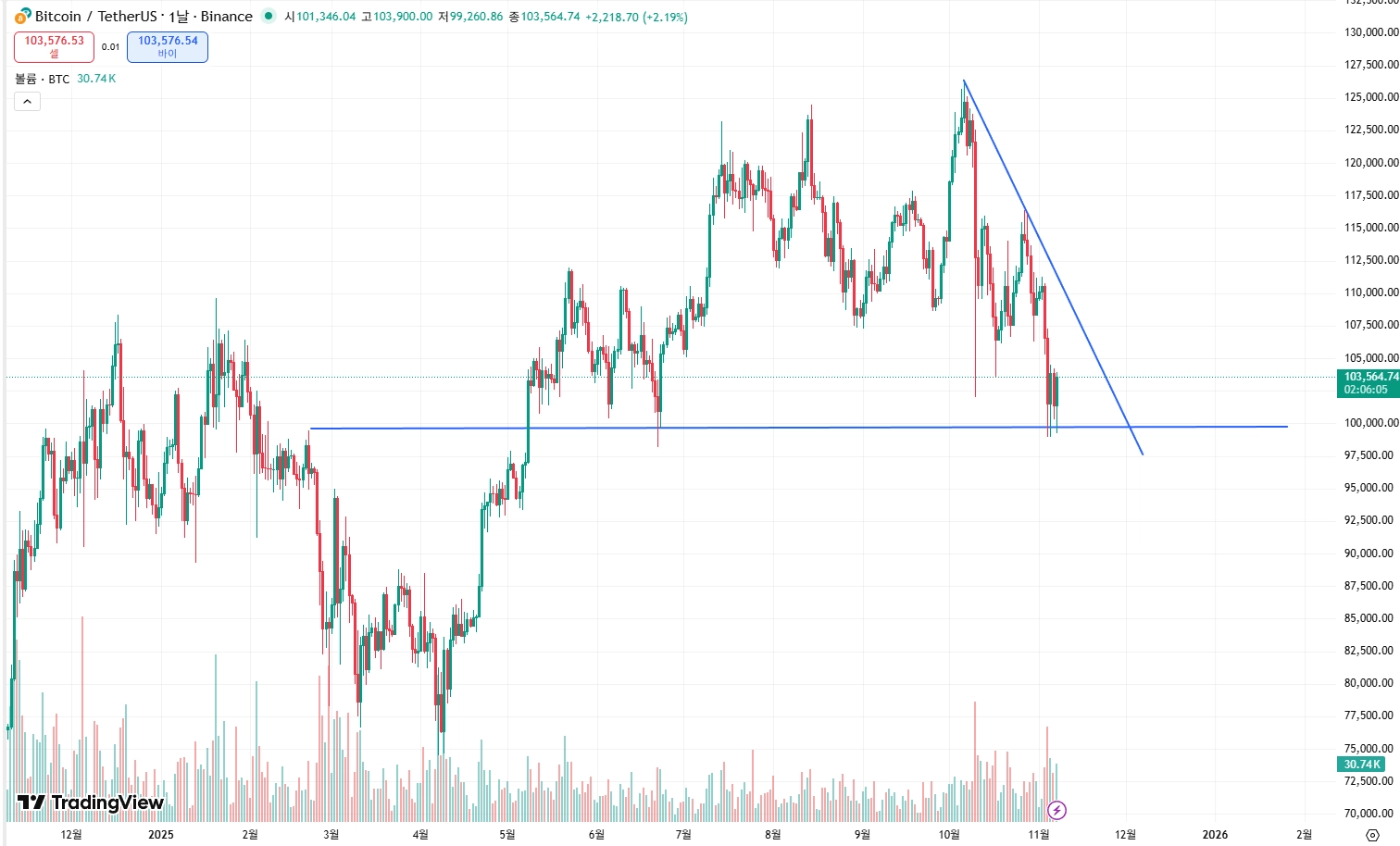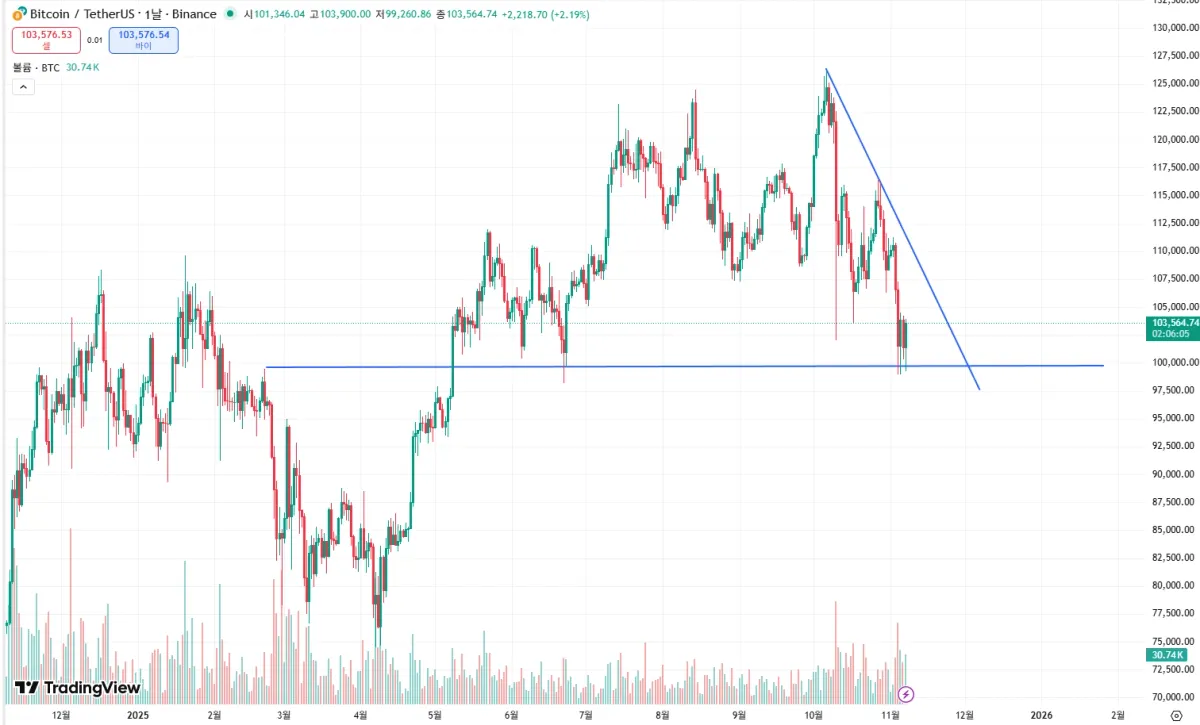 하락추세선과 수평선을 그려 9만8천달러선을 지지선으로 보고 있습니다.