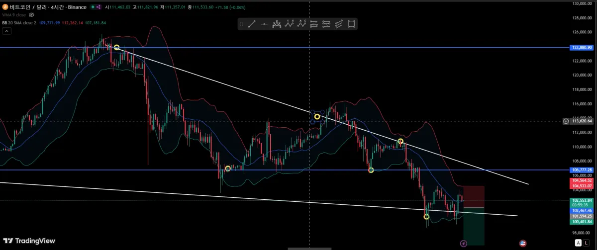 동평균선 보았을때 수렴(하락)후 대폭 하락할것이라 예상 (하락장이라는 판단하에) / 이후 숏진입 3% / 2.9%상승시 손절 5.1% 하락시 익절 설정후 5배레버리지 진입