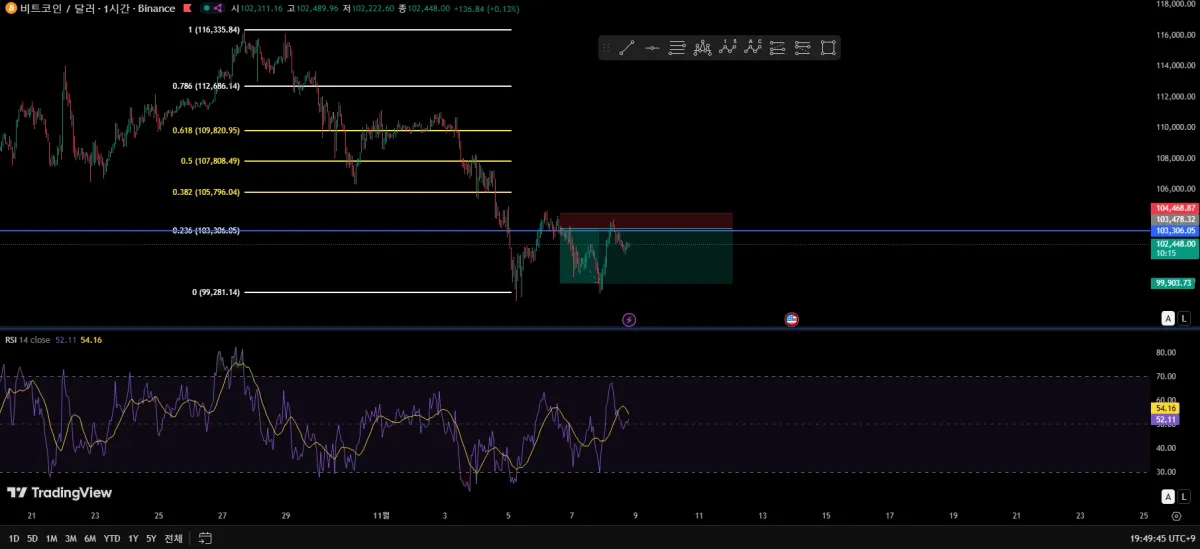 피보나치 0.236 지지 저항선으로 잡고 숏 진입 103500 , 전체적으로 시장이 하락추세라 1:3 손익비 거래를 추구했고 조건은 만족했지만 스탑로스를 제대로 걸지 못해서 못 팔고 103200 부분에 직접 익절