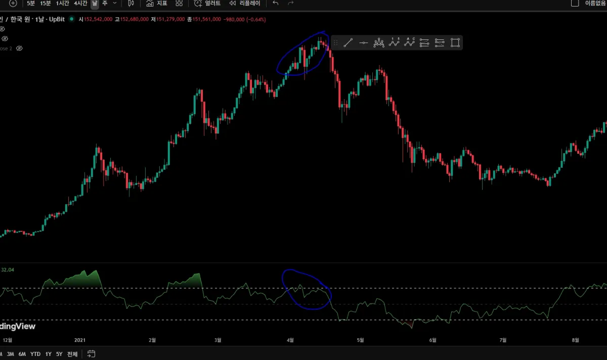 차트는 상승하고 있지만 rsi는 하락하는 모습을 보여줘 결국 하락장이 되었습니다