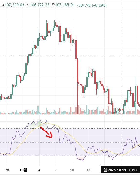 비트코인 1시간 봉입니다. 거래량이 점차 줄고 매도세가 늘며 하락 다이버전스로 전환되었습니다.