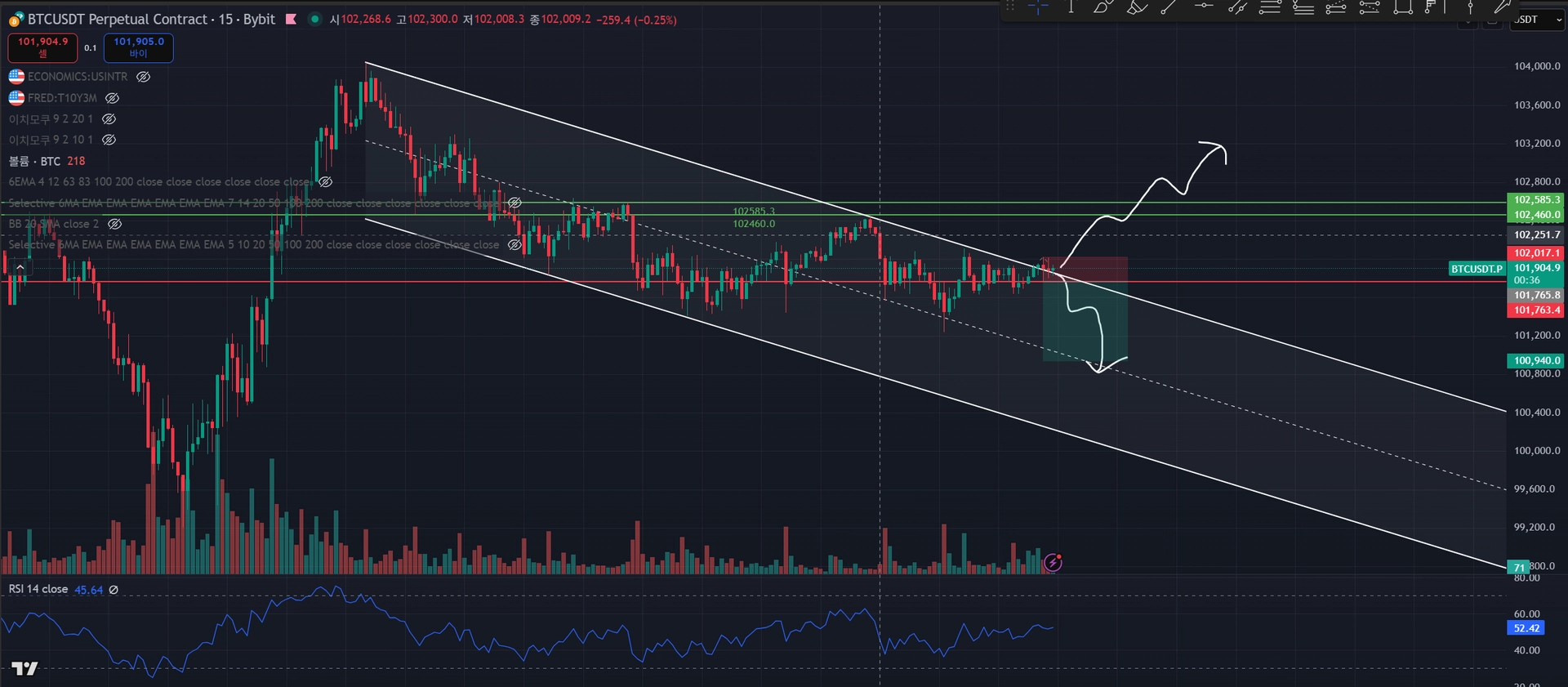해당 선에서 절반 1차 익절(102460.0, 102585.3)하고 저항선을 뚫고 계속 올라가면 해당 저항선을 익절자리로 잡고 계속 추세를 타고 104047.6(15분상 하락채널의 하락이 시작된 곳의 고점)까지 들고가는 것 입니다.