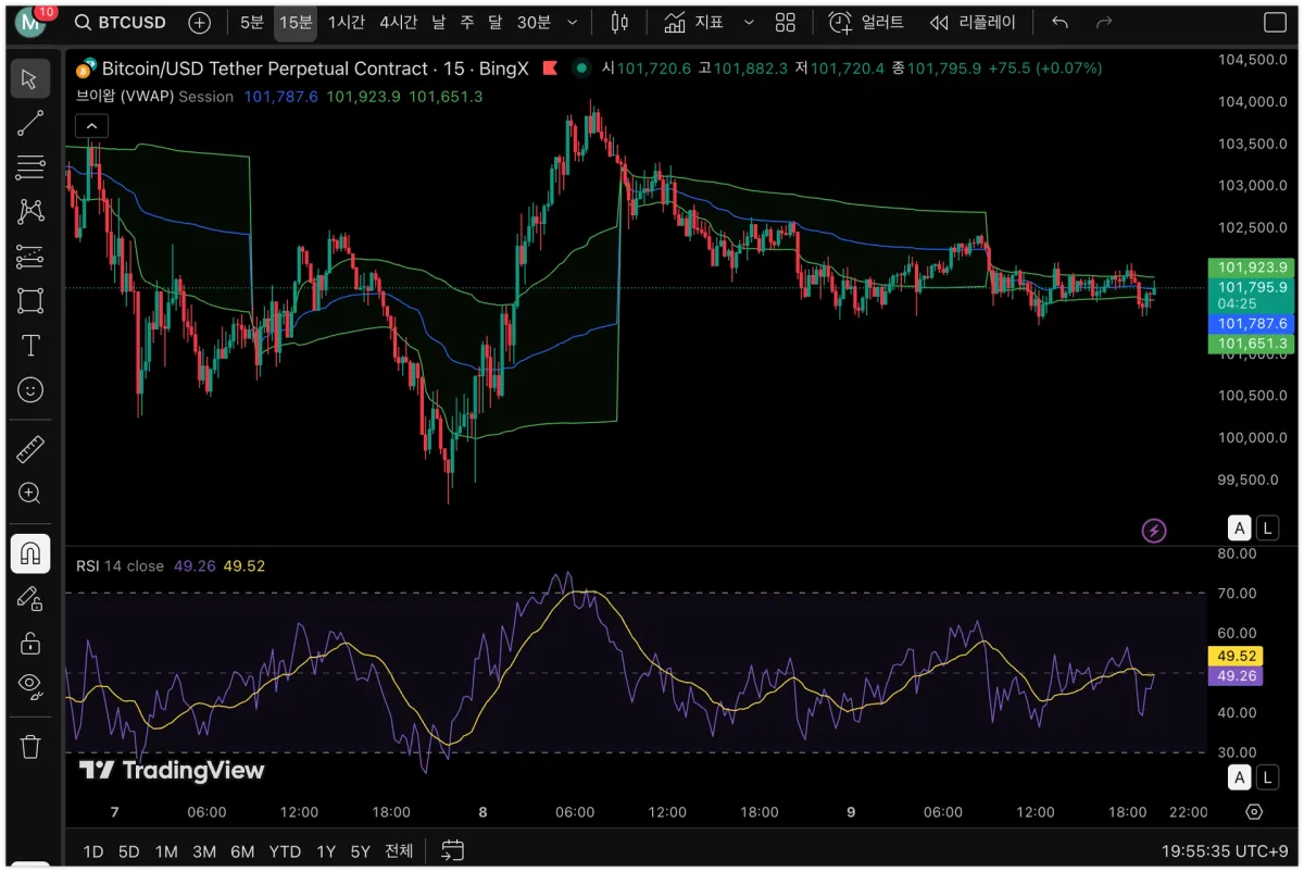 70의 경우에는 과매수, 30의 경우에는 과매도로 잡고, 해당 구간에만 매수, 매도하는 방법의 트레이딩도 가능합니다.