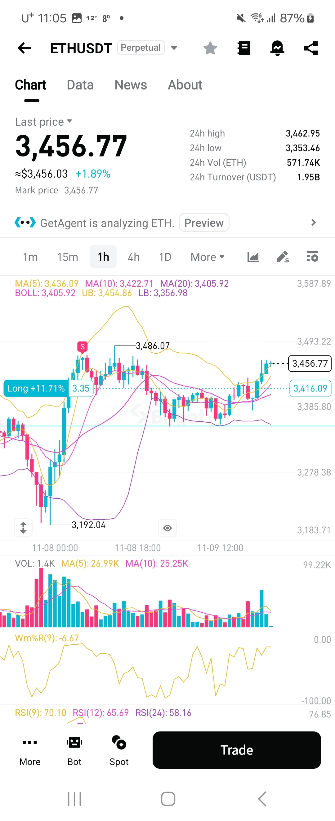 현재 한시강봉 단기지지선을 긋고 볼린저밴드하단 +단기지지선에 롱자리 들어갔습니다 현재 수익실현은 하지 않고 계속들고가고 있습니다.