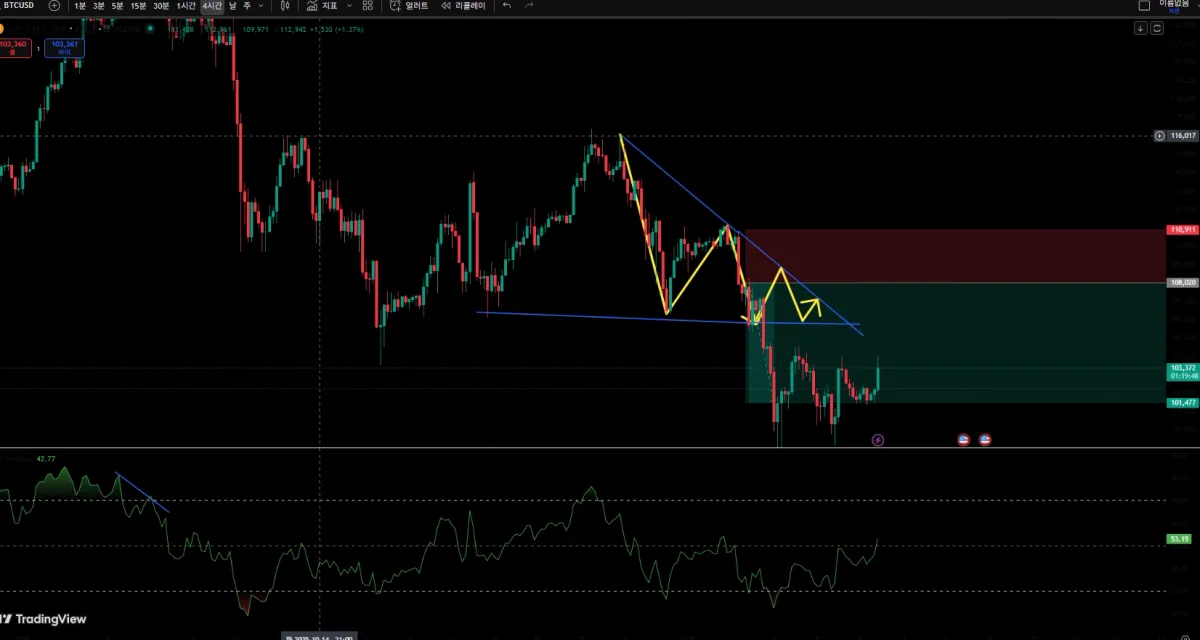 11월 3일 오전 큰 하락을 보고 숏 포지션을 생각했습니다. 캔들 하나 더 보고 진입하려고 생각했습니다. 주요 저항은 108,020~109,725로 보였고 상단 극점은 110,911 부근으로 확인했습니다. 주요 지지는 101,5xx → 98,000 → 97,000대 순으로 추정했습니다. RSI(4H)는 약 52로 중립권으로 보여집니다. 거래구간은 차트의 초록색 박스로 한정했습니다. 저항대 도달 후 반전 신호가 나오면 숏을 분할 진입할 것입니다. 110,911을 상회한 4시간봉 마감이 나오면 전량 손절 할 생각이였습니다. 목표는 1차 101,5xx, 2차 98,000, 최종 97,000대로 설정했습니다. 손익비는 1:2로 진행할 것입니다. 110,911을 돌파해 지지로 전환되면 숏 관점은 무효로 보겠습니다. 그 경우 관망 후 재평가하려고 했었고 결과적으로 숏이였습니다.