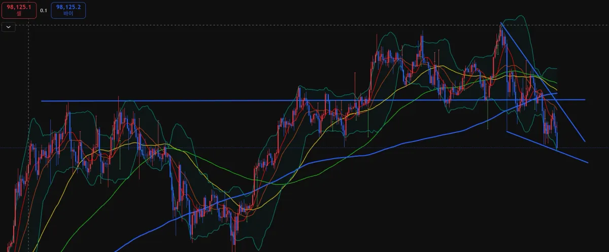 현재는 전고점의 지지선을 뚫렸으며, 하락 추세를 나타내고 있는 모습으로 보이네요