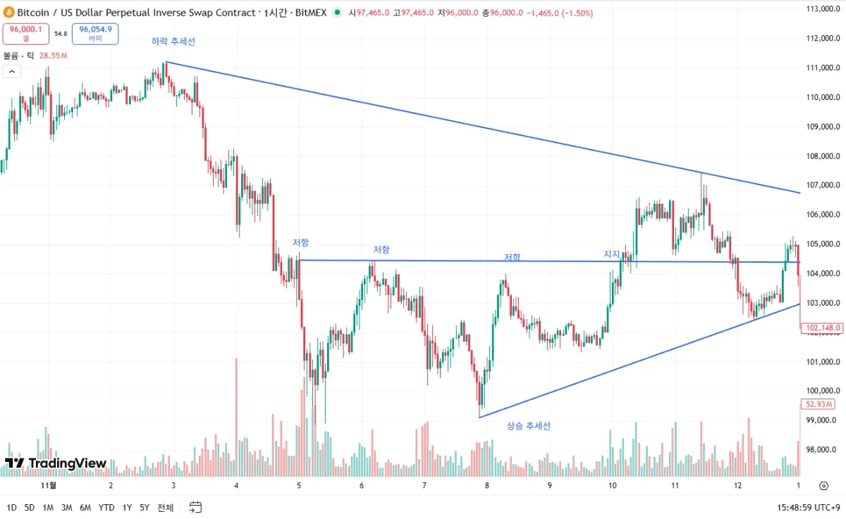 안녕하세요, 답변 드립니다 :) 1. 11월 5~8일의 저항이 10일에 지지로 바뀐 건 맞고 이 구간을 하나의 박스권 구조로 봐도 무방합니다. 다만 아주 깔끔한 직사각형 박스라기보다는 “저항 전환 → 지지 확인” 흐름에 가까운 구조라고 이해하시면 더 정확합니다. 2. 말씀하신 것처럼 구간을 어디서 자르느냐에 따라 상승·하락이 상대적인 것처럼 보일 수 있습니다. 그래서 기본 원칙은 “큰 흐름(상위 타임프레임) 기준 → 작은 흐름(하위 타임프레임) 해석”입니다. 전체 흐름은 하락 추세인데 그 안에서도 8~11일처럼 단기 반등파(데드캣, 조정 반등 등)가 나올 수 있는 거죠. 3. 봉 선택은 목적에 따라 달라집니다. 트레이딩 방향성 판단은 보통 4시간봉·일봉 기준으로 보고 세부 진입/손절은 5~15분봉에서 잡고 큰 주기(추세, 싸이클, 유동성)는 주봉·월봉으로 확인하는 식입니다. “상위봉으로 큰 구조를 잡고 하위봉으로 세부 실행” 이게 가장 안정적인 방식입니다. 그리고 최근 제가 ‘추세선 작도’ 관련해서 라이브를 진행했었고 지금 편집 중이라 조금만 기다리시면 정리된 영상으로 훨씬 더 쉽게 이해되실 겁니다. 30일 버티기 도전하는 마인드 너무 좋습니다. 조급함만 줄여도 이미 반은 성공하신 겁니다.