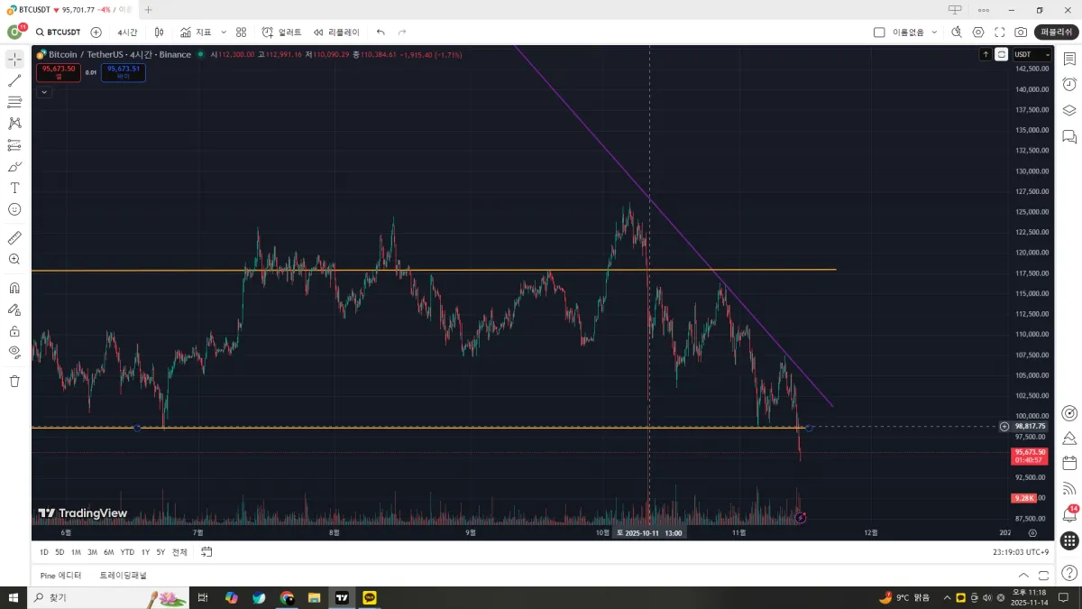 오렌지색선은 지지와 저항선이고 보라색선은 하락추세 선입니다