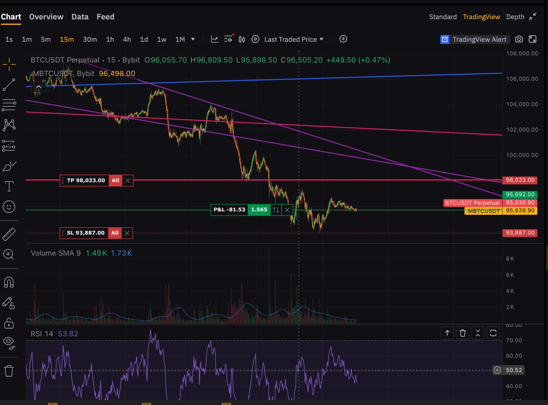 ③ 익절 목표 설정: 목표가(98,033)를 과거의 주요 저항선이라고 판단함. 따라서 저항가에 닿을 것이라 기대