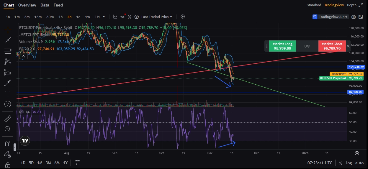 1일봉에서 볼린져밴드 하단선을 터치했지만, 4시간봉에서는 하단선과 이격이 발생 (추가 하락 신호)