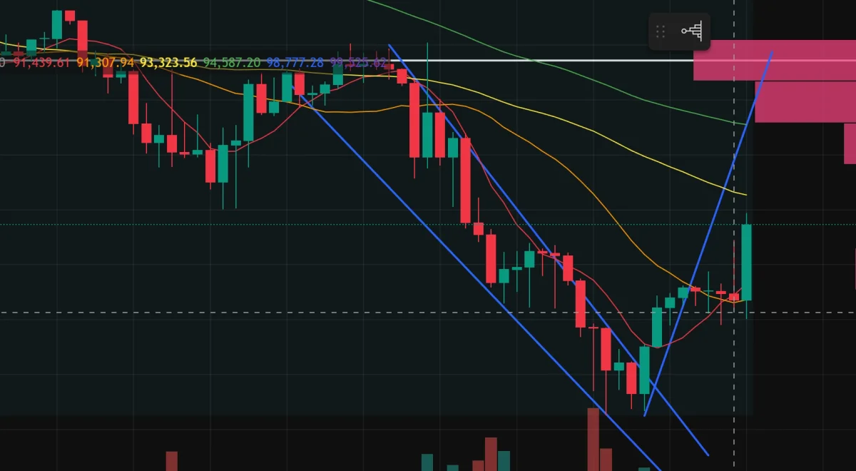 숏으로 진행 했었구요. 구매했던 근거는 7일선과 20일 이평선이 골든크로스 난 상태였고 폴링 웻지패턴으로 최저점 갱신후 잠시 rsi급격히 떨어지고 50선 까지 회복되고 다시 큰 하락이 올거라고 생각했었는데, 갑작스러운 큰 반등이 일어나면서 숏포지션 실패했네요. 거래 매도량을 보고 들어갔던 거였는데 바로 다음 거래량이 매수세에 비해 급격한 상승이 일어났네요. 근거 부족 일수 있는것 같습니다.