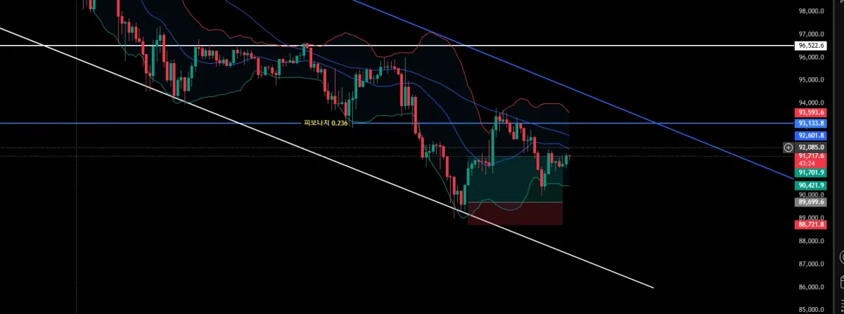 방향이 좌우 반전이긴 하지만,, 어센딩이라고 판단하였고, 추세선에서 반등이 나오는 구간인 89,653에서 매수를 들어가 보았고, 손절은 약 1%로 잡아보았습니다. 익절 구간은 2%로 잡았습니다. 하지만 아직은 좀 두려움이 있어 좀 일찍 나왔습니다. 아쉽긴 하지만 그래도 생각을 했던 내용으로 나와서 좀 신기했고 기분이 좋았습니다. 빨리 30일 챌린지 끝나고 될 수 있다면 우등생 방에 들어가 더욱 더 많은 걸 배우고 싶은 마음이 굴뚝 같습니다!!! (레버는 원래 10이 맞으나,, 무서움에 내려서 들어갔습니다)