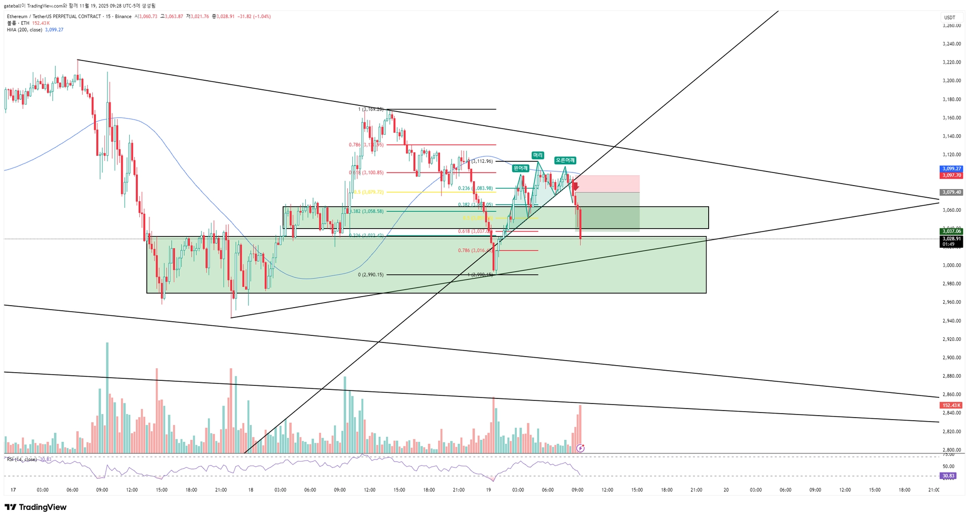 직전 하락 파동에서의 피보나치 되돌림에서 0.618되돌림을 터치한 후 헤드 앤 숄더 패턴이 나와 숏 포지션을 진입하고 손절은 직전 고점으로 잡았습니다.