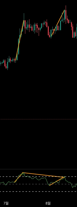 주황선의 경우 주가는 올랐는데 rsi는 하락을 보였으므로 하락 다이버전스가 나타난 것으로 보입니다.