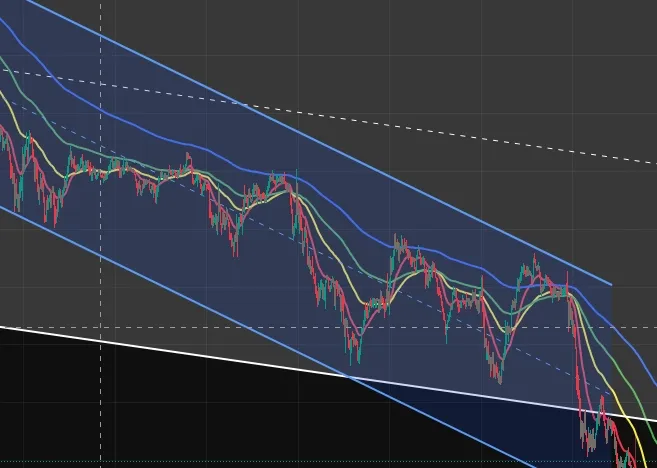 큰 하락채널과 그 안에 있는 하락채널의 공통된 하단을 맞고 단기 바닥으로 짧은 상승을 할것으로 예상이 되어 지지를 받고 상승하는 차트를 따라 들어갔습니다.