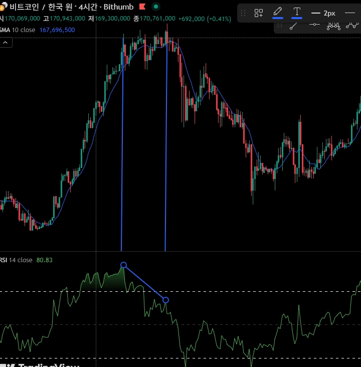 우선 고점보다 가격은 올랐지만 매수세는 떨어졌고 그로 인해 가격이 하락한 다이버전스 구간!으로 판단하였습니다...맞나요 .. ? ㅜㅜ