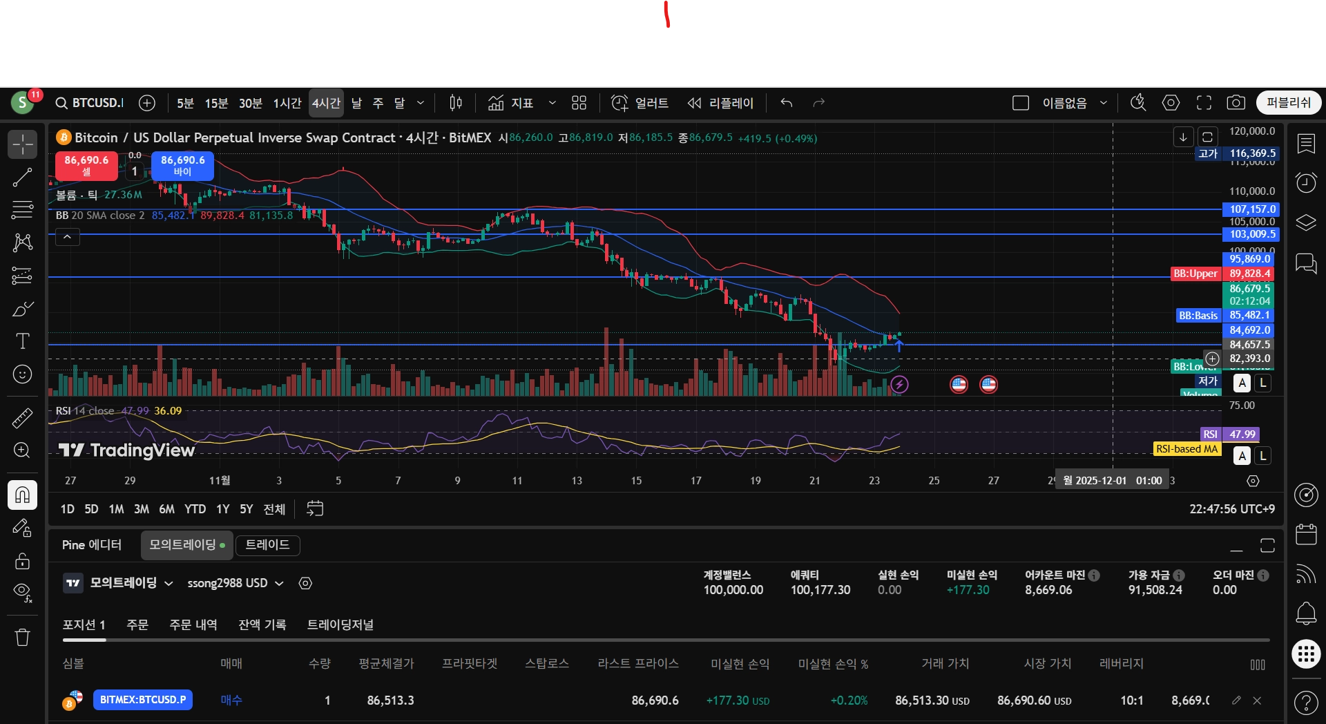 진입근거는 볼린저밴드의 20일선에서 상승 추세로 보고 들어갔습니다