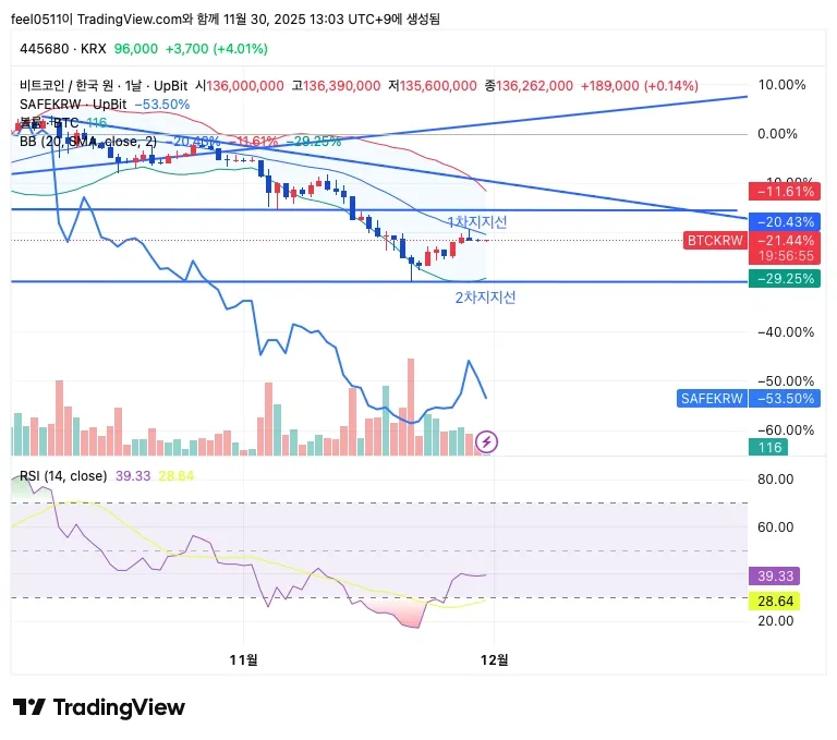 25년 4월 21일 기준으로 2차지지선으로 생각하여 2차지지선이 뚤리면 더욱 하락할것을예상 , 방어에 성공하면 상승가능성이라고 생각했고 11월23일 상향,rsi지표를 보고 진입 했습니다. *