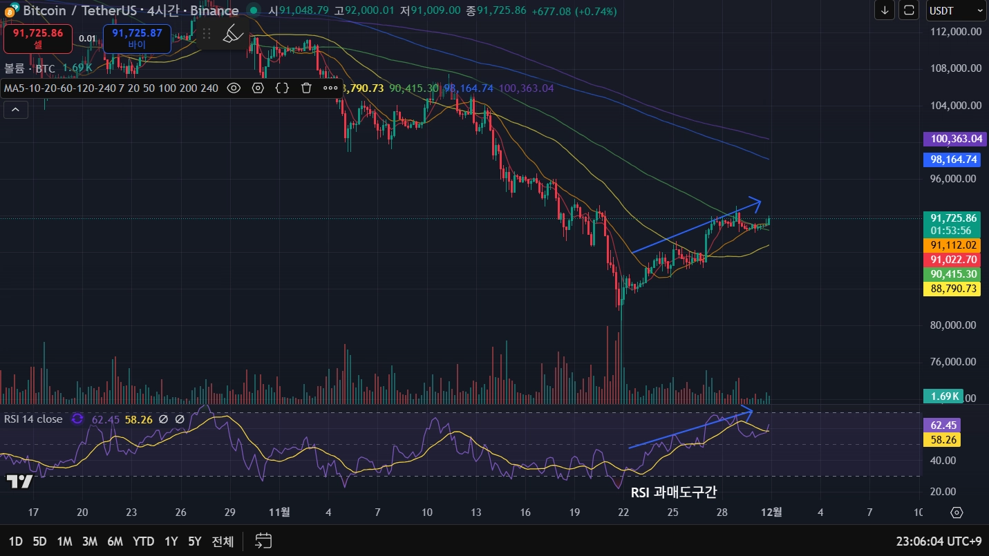 RSI 과매도 구간 (>30) 이후 상승 추세 -> 차트 상승과 매칭됨