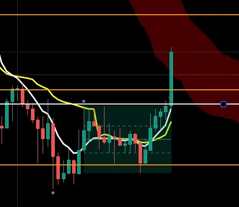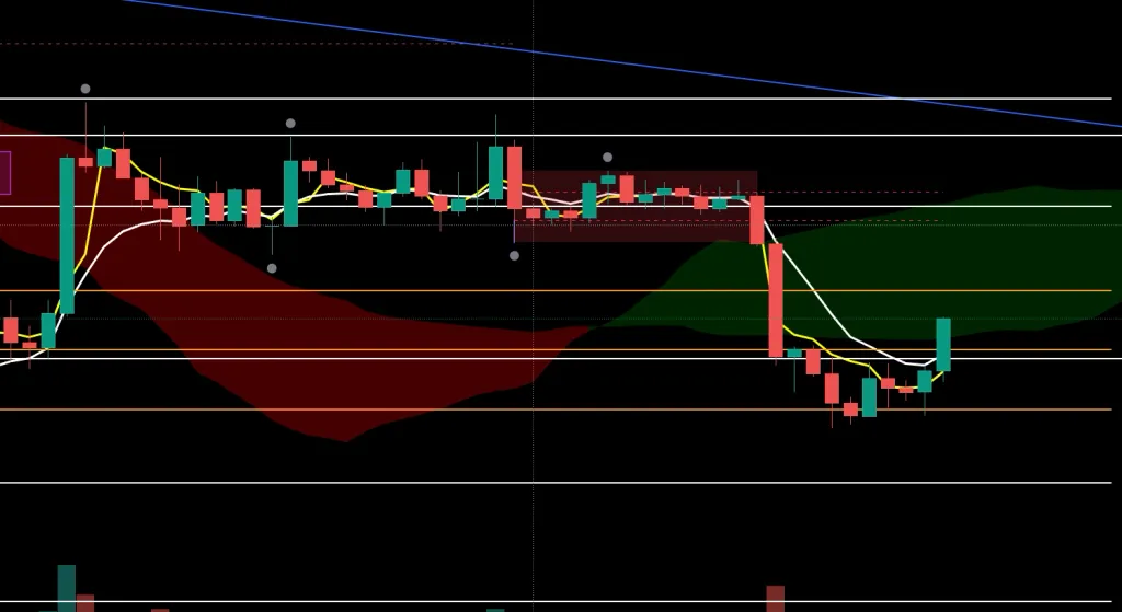 1시간봉으로 보았을때 쌍바닥 패턴을 보이며 최근 저점이 아래꼬리를 달고, 연속으로 나오는 양봉과 함께 이전 저점보다 높게 종료했으므로 쌍바닥패턴으로 상승추세를 생각하고 넥라인을 기준으로 돌파 유무를 확인했다.