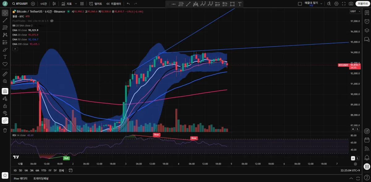 12월 3일 약 3시부터 7시까지 가격은 상승하나 RSI의 경우 하락하는 모양새를 띄고 있습니다. 이후 하락 진행될 것으로 예측됩니다.