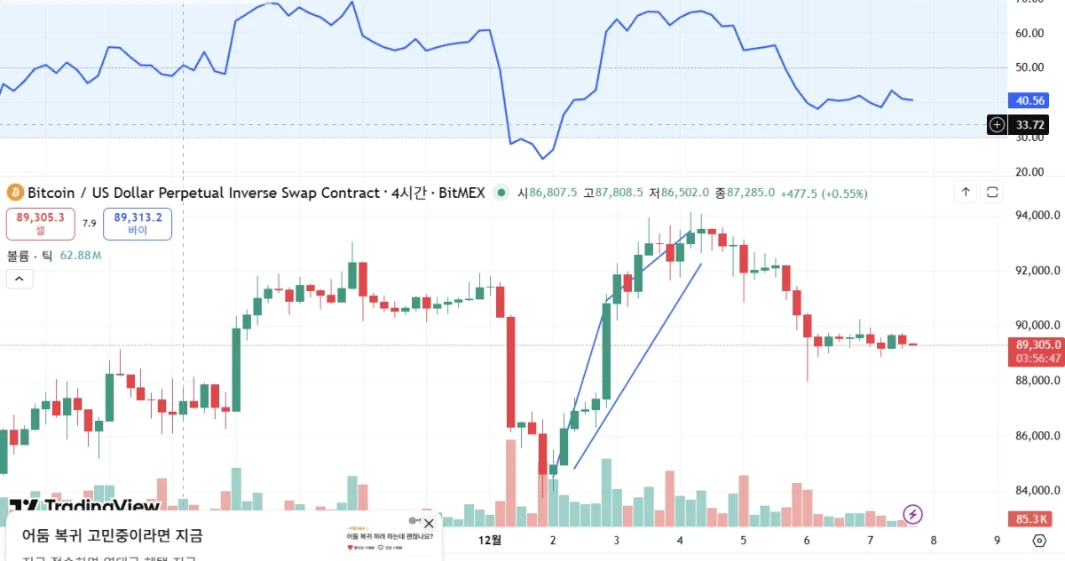 RSI 지표 23에서22이 까지 떨어져 롱으로84600에서 들어가 90000에서 손절했습니다