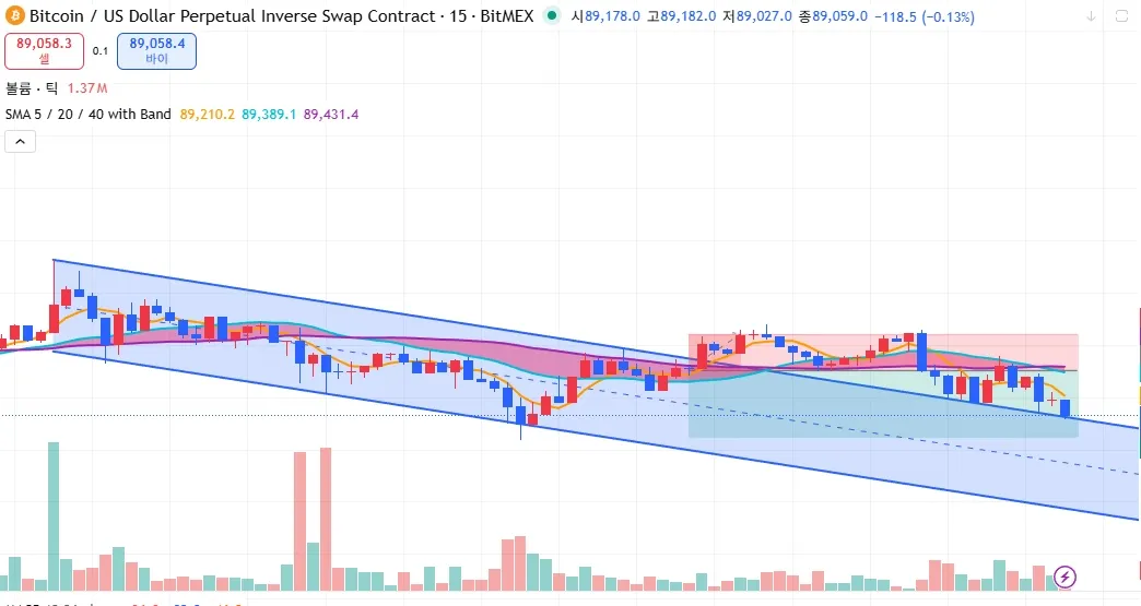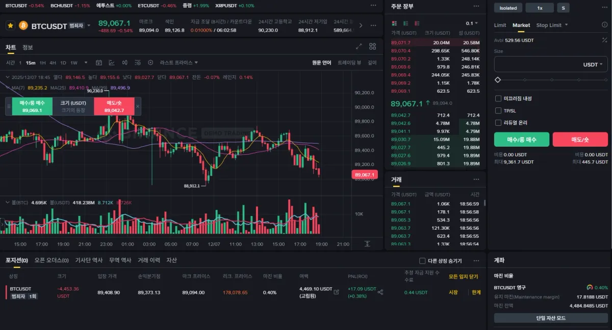 - 투자 근거: 트레이딩 뷰 15분봉(12/7 12:00 시점) 기준 하락 추세선을 그었을 때, 해당 채널 안에서의 고점이라고 판단하여 숏 포지션을 잡고 89,408USDT에 진입하였습니다. 익절가는 88,900USDT로 잡았습니다. 현재 89,097USDT로 0.34% 이득을 봤습니다.