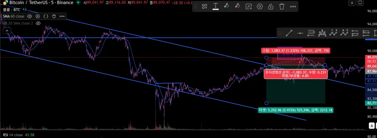 숏 포지션 이유: 추세선을 그려봤을때 지지와 저항선이 명확히 그려졌다고 생각했었음