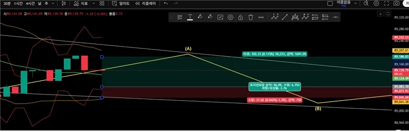 추세선도 맞고, 볼린저밴드도 맞았고, 추세변화까지 본 후 들어가서 예상대로 움직여 주었음.