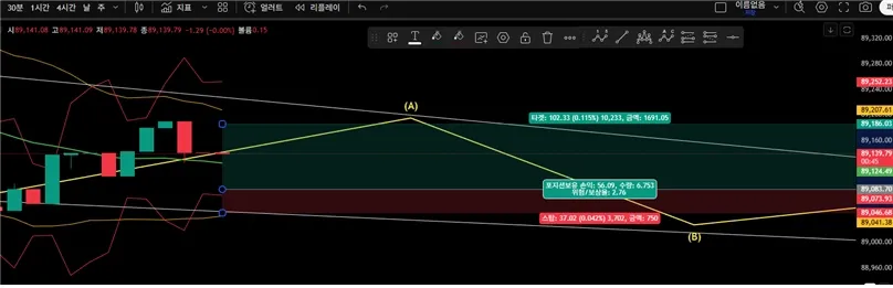 추세선도 맞고, 볼린저밴드도 맞았고, 추세변화까지 본 후 들어가서 예상대로 움직여 주었음.