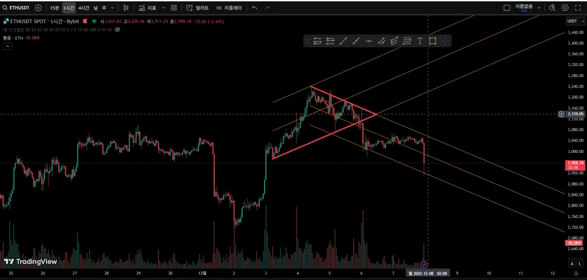 가장 최근 포지션 매매 복기를 해보면 금요일 밤에 이더 삼각수렴 패턴후 하방 이탈을 예상하여 숏을 진입하였음