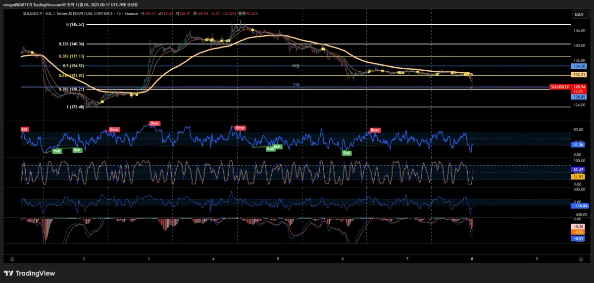 레버리지 30배 솔라나 코인이고 익절은 0.5라인 134.5 정도 생각중입니다. 아직 다른 스킬들은 잘 못쓰겠어서 피보나치랑 rsi cci macd 이렇게 4개정도가 과매도라고 판단되면 들어갑니다.