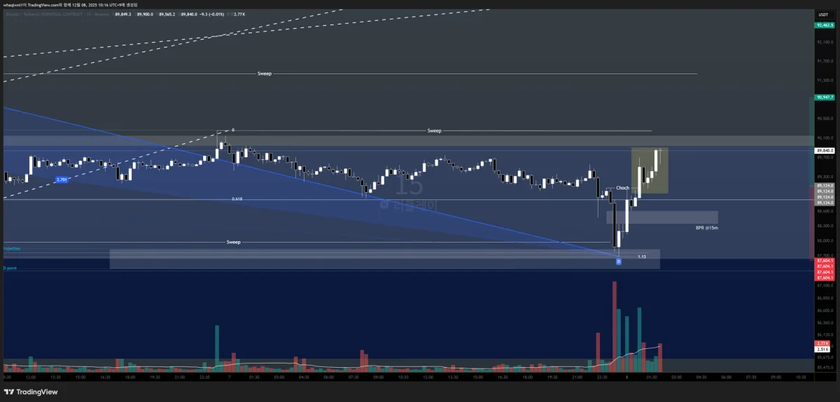 15분봉에서도 BPR을 만들어주며 choch가 발생, 1차 진입