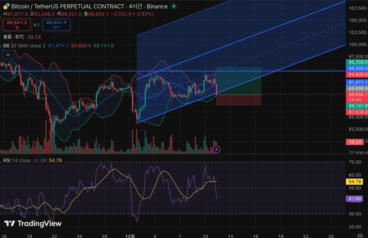 채널 안 전 고점인 94500K에서 물량의 반을 익절 걸어놓고, 채널 중단선에 도달하면 전체익절한 후 상황을 지켜볼 예정, 거래량을 보아하니 trap이 발생될 확률이 있어보여 채널 안 전 저점인 87500보다 조금 낮은 가격인 87300에 스탑로스 설정.
