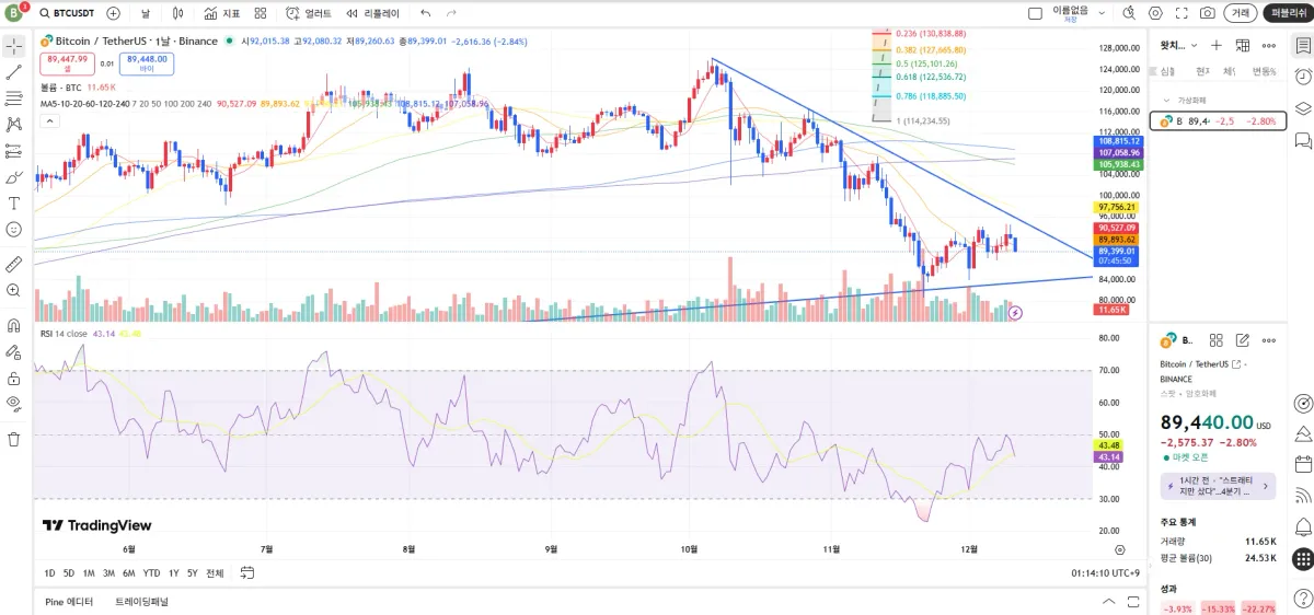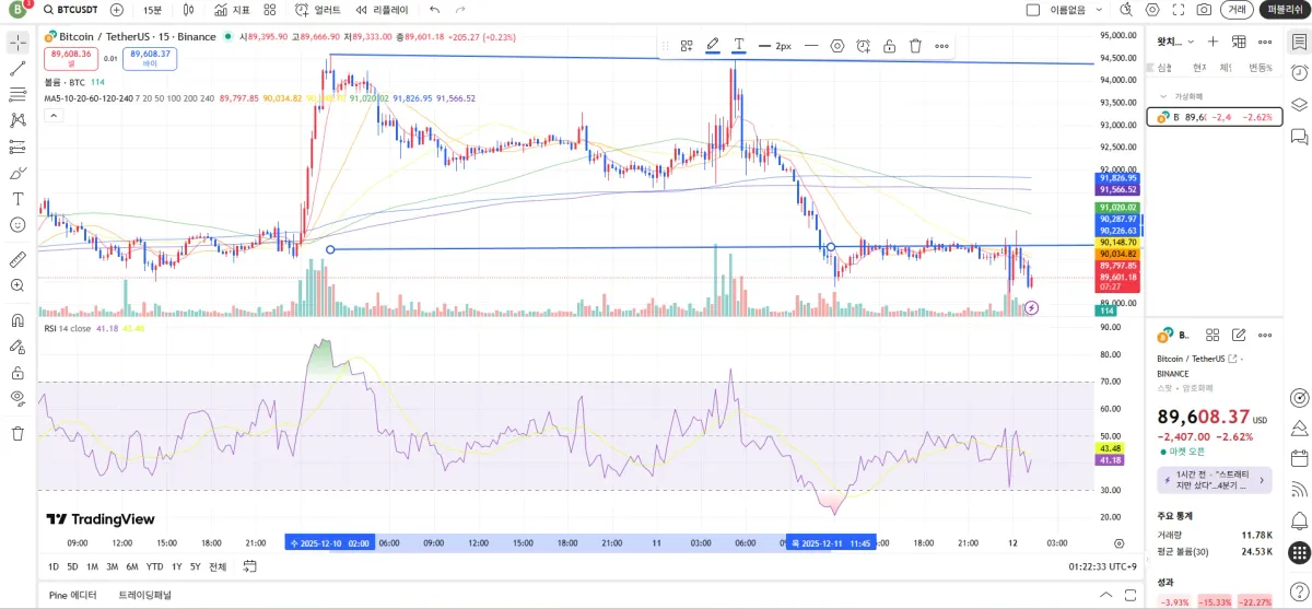 현재 비트코인에 대해서 월봉과 주봉을 보았을 때 가격은 오르지만 매수세가 약해서 가격 하락이 예상되고, 일봉은 매수세가 세지만 매도하려는 세력이 하락장에서 손절하는 추세이고, 4시간봉과 1시간봉을 보았을 때는 고점을 이은 추세선에 닿지 못하는 상황이며, 15분봉에서는 횡보구간으로 아래의 지지선이 11:45를 기준으로 저항선으로 바뀐 것으로 보아도 될까요?? 그렇다면 매수 전략을 어떻게 세우는게 좋을까요??