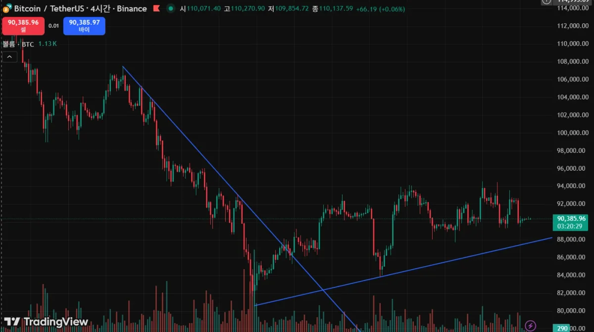4시간 봉에서 하락 추세선과 상승 추세선을 그려봤습니다